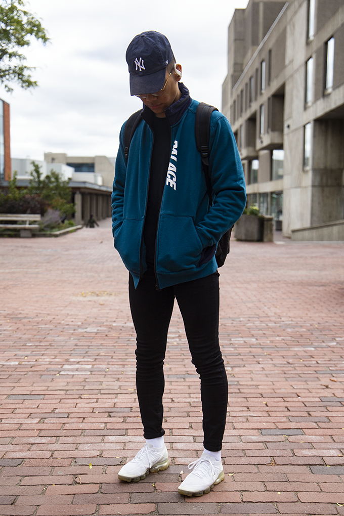 To start is Renzel Villegas (@hellorenz), in a modern streetwear ’fit. He describes his style as: “Just putting on what looks good and not trying to force anything. Simple, nothing too loud, things that work together.” He gets his inspiration from streetwear influencers, such as Levi Bent-Lee and Kai Bent-Lee, and stylish athletes that are the same age as him, such as Franklin Jackson of the New Orleans Pelicans. His fall statement piece is the Aimé Leon Dore polar fleece pullover.