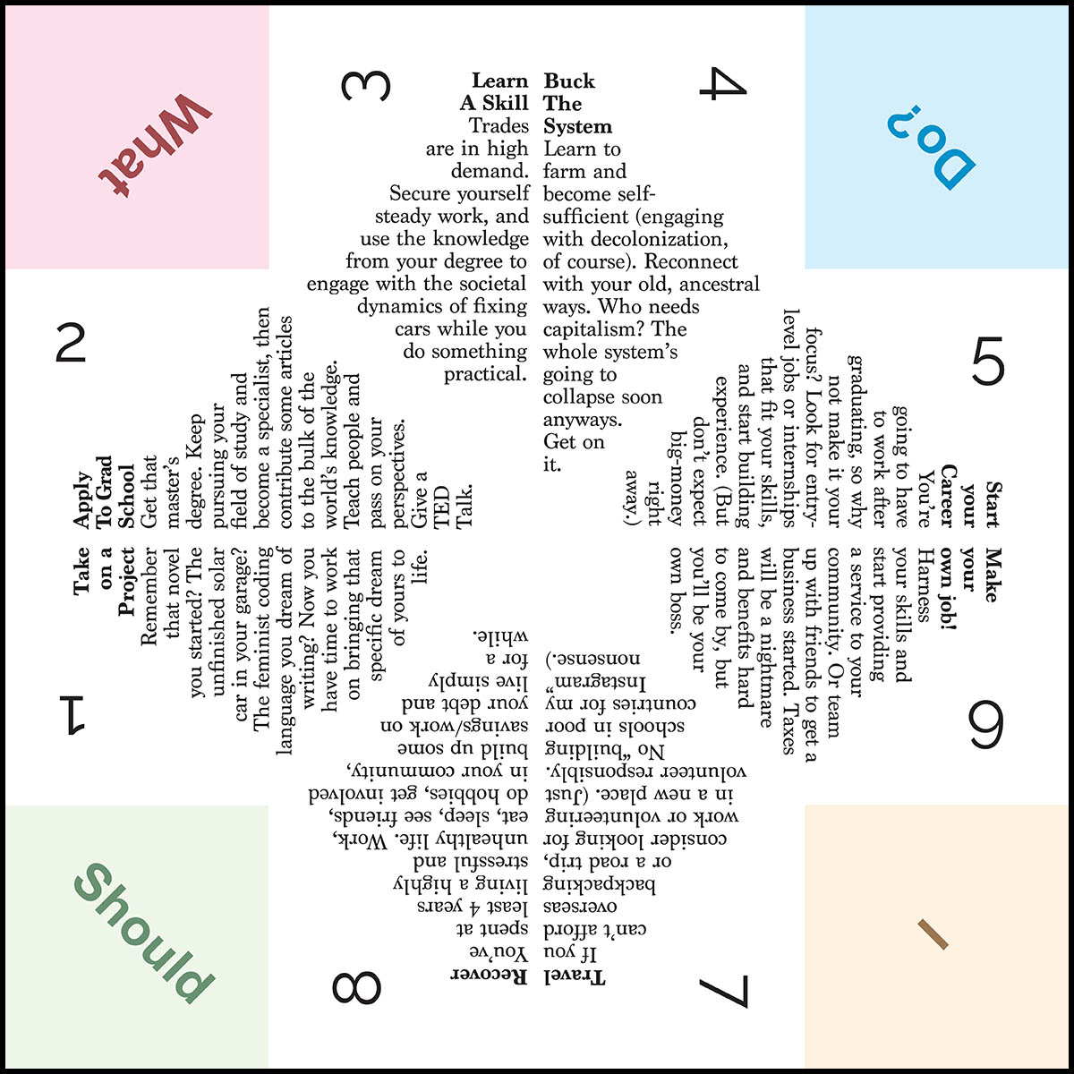 Graduating soon and have no idea what to do with yourself? In first year and still not entirely sure why you’ve signed up for this degree? Halfway through and seriously questioning your commitment? Never fear! Making big choices may be harder than ever in the 21st century, but The Ontarion has you covered. Simply download, print, and fold our complimentary fortune teller! Pick a colour and a number, and let chance determine your next move — no nail biting required. Who knows, you may get some much-needed inspiration, a potential path you hadn’t thought of, or a gut reaction that will teach you something about yourself and what you truly want to do.