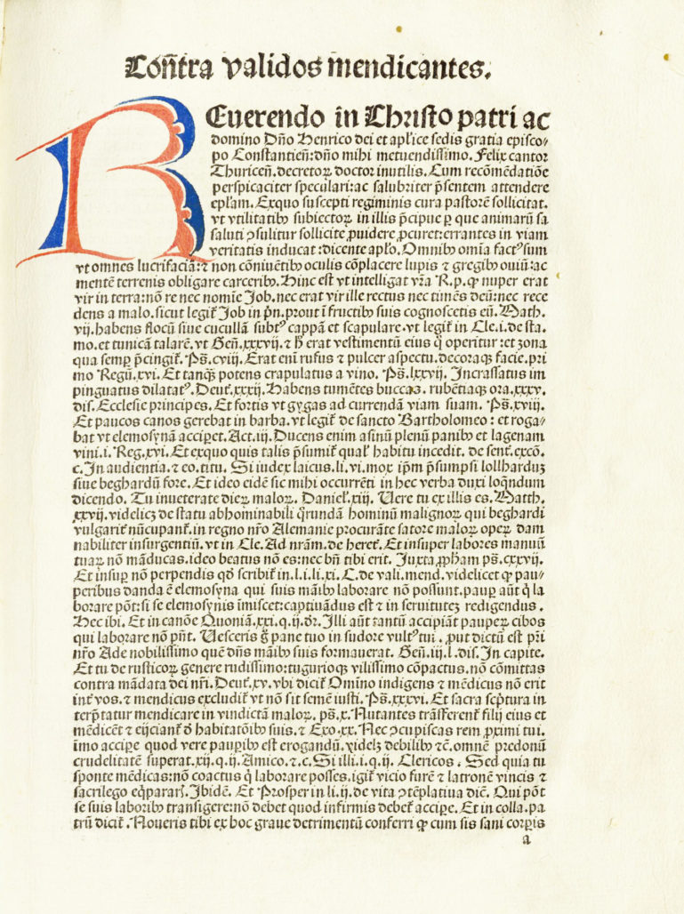 The original book would likely have been purchased unbound, at which time the purchaser would then have had to make arrangements to have the book bound. The letters at the bottom of the pages (A-Z and aa-gg), called “signatures,” instructed the binder on the order that the gatherings (groups of unbound leaves) should be sewn together. The hand-drawn letters and decorations found in incunables were just as exquisite as those found in manuscripts. Although the printed text was usually uniform across all copies of the print run, the rubrications and decorations were often unique. Comparisons with other digitized copies of Hemmerlin’s book show, for example, that some copies do not have the rubricated initials as ours does.