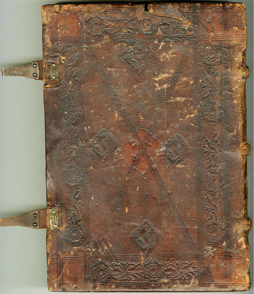 Our copy of the Opuscula et Tractatus is bound in contemporary, blind-stamped calf over wooden boards, with the original metal clasps and catches still intact, and shows evidence of having been chained (see picture above). Books of the Middle Ages were expensive and valuable possessions and were sometimes chained to a desk or a lectern to discourage thieves. The chained binding also indicates that this book was likely owned by a college or ecclesiastical institution. Of interest to the University of Guelph are a series of four stamped gryphons (although some might call them dragons) on the back cover.